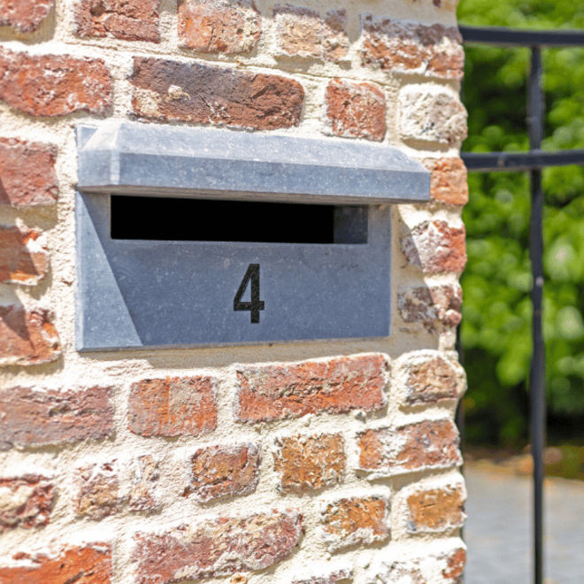 - Naam- en huisnummergravure mogelijk, maximaal 15 tekens per regel. Hoe meer tekens per regel, hoe kleiner de gravure wordt.