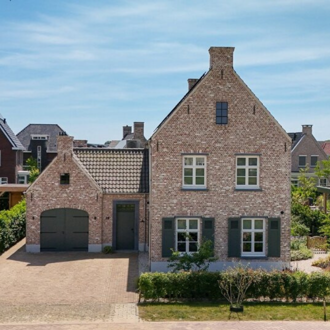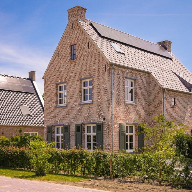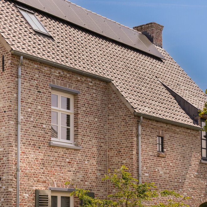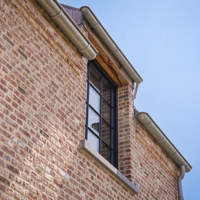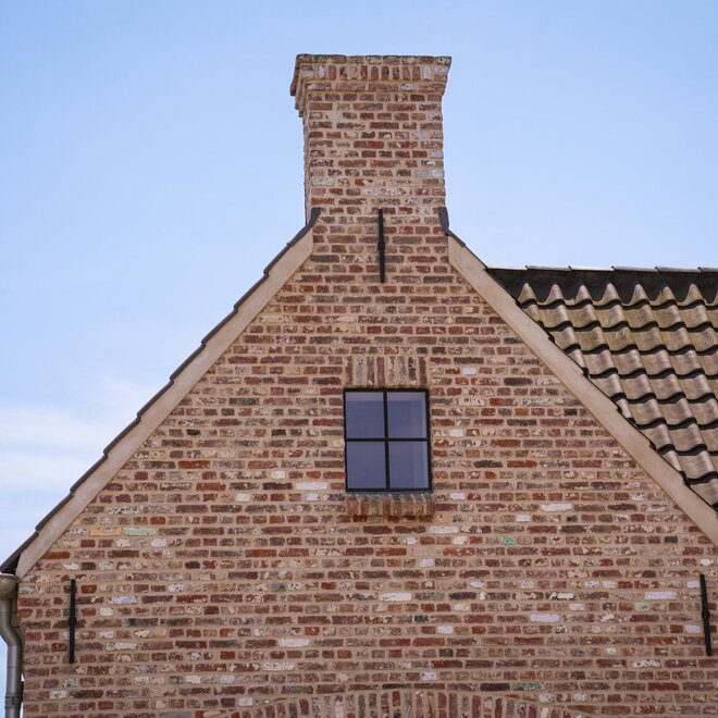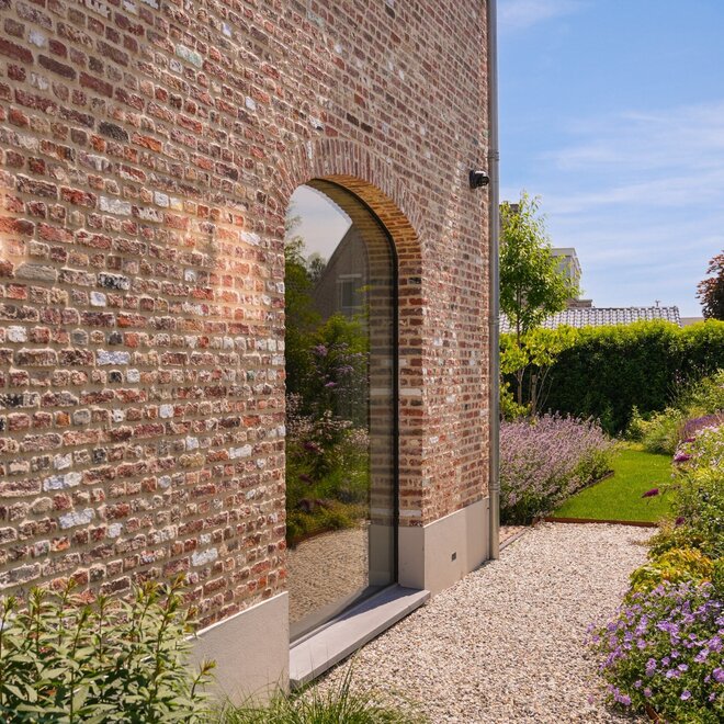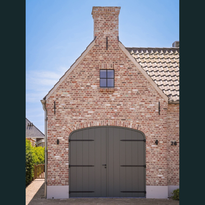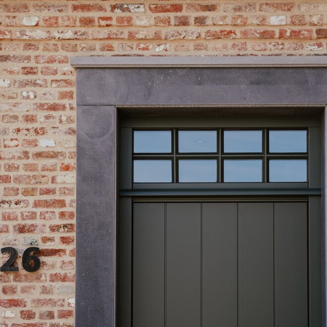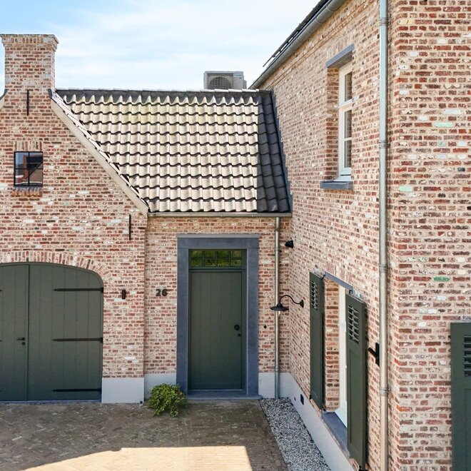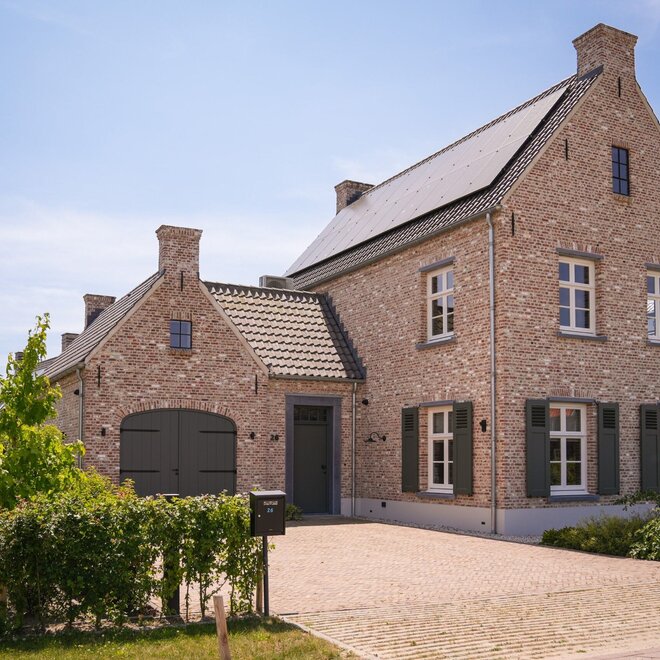 Die tussensluis naar de berging, leuk is dat hè? Deze Kempische woning mochten wij voorzien van diverse materialen waaronder deze bijzondere schoorstenen, het staallook kozijn en de hardstenen voordeuromlijsting. Ook is bij deze woning te zien hoe zonnepanelen kunnen staan bij de Kempische bouwstijl.