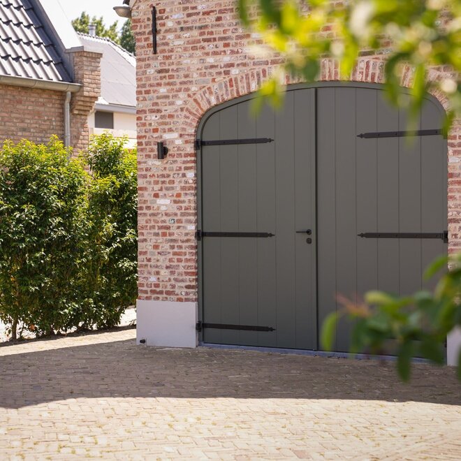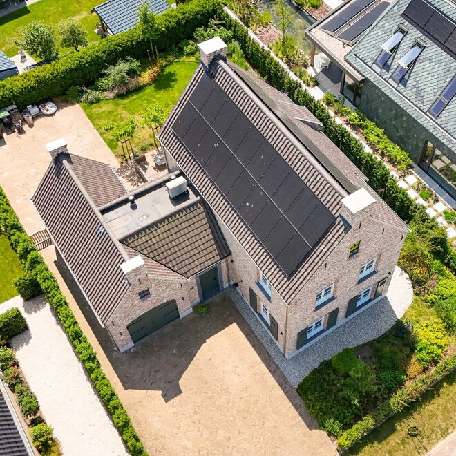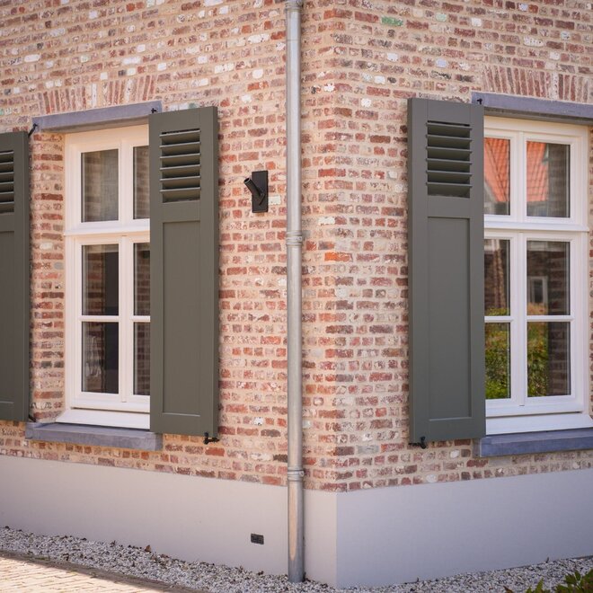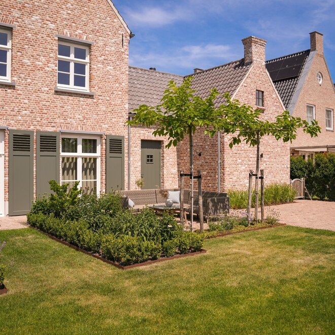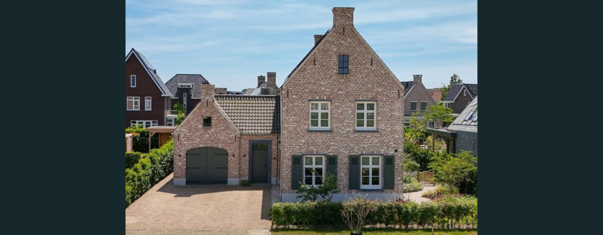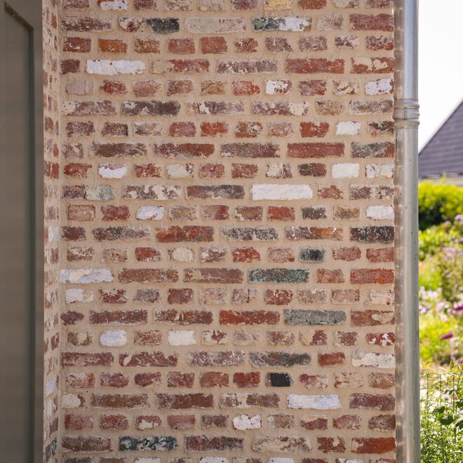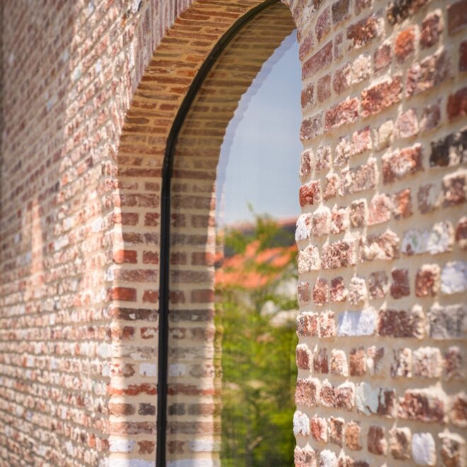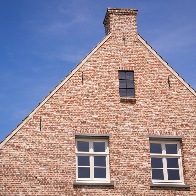 Die tussensluis naar de berging, leuk is dat hè? Deze Kempische woning mochten wij voorzien van diverse materialen waaronder deze bijzondere schoorstenen, het staallook kozijn en de hardstenen voordeuromlijsting. Ook is bij deze woning te zien hoe zonnepanelen kunnen staan bij de Kempische bouwstijl.