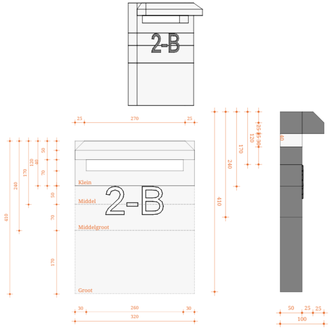 De box heeft een minimale inbouwmaat van 35cm of 40cm. U kunt deze uitschuiven tot maximaal 50cm of 55cm. De ingemetselde brievenbus heeft een dikte van 5cm. Heeft u een poer van tussen 40cm-55cm dan kiest u voor de boxafmeting 35-50cm. Heeft u een poer van tussen 45cm-60cm, dan kiest u voor de boxafmeting 40-55cm